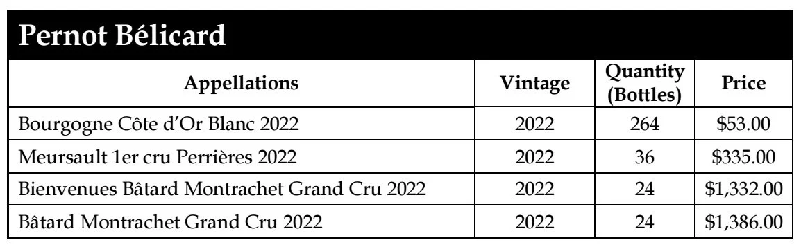 These are easily the best set of wines produced from Pernot-Belicard to date, and they represent stellar values from the entry-level Bourgogne Blanc all the way to the top 1er Cru Puligny-Montrachet and Meursault offerings.”