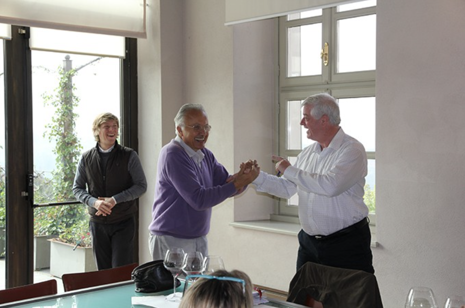 JJ telling stories: Angelo Gaja & JJ at the castle in Barbaresco. A Tony Blackwell photo.
