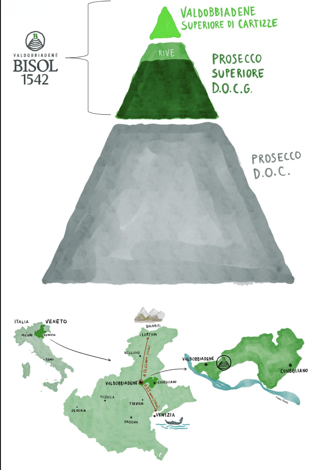 The Prosecco Superiore appellation, to which Bisol1542 belongs, originates in the historic area of vocation of the Glera grape and accounts for about 20% of the total Prosecco production