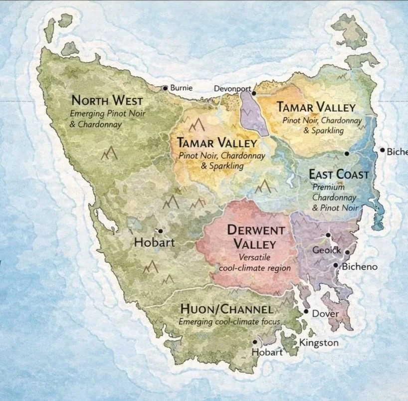 Tasmania is Australia’s coolest major wine region, with the lowest average summer temperatures and a growing season shaped by its island position and surrounding oceans. Vineyards are spread across several areas, including the Tamar Valley in the north and the Coal River Valley in the south, each with its own conditions.